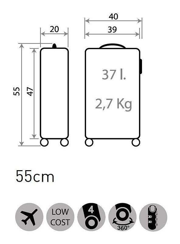 Cestovní kufr ABS je luxusní plastový kufr. Cestovní kufr 55 cm je vyroben z pevného ABS plastu a má 4 otočná kolečka, integrovaný zámek s číselným kódem. Rozměr kufru umožňuje použití též jako kabinové zavazadlo vhodné i pro nízkonákladové lety.
