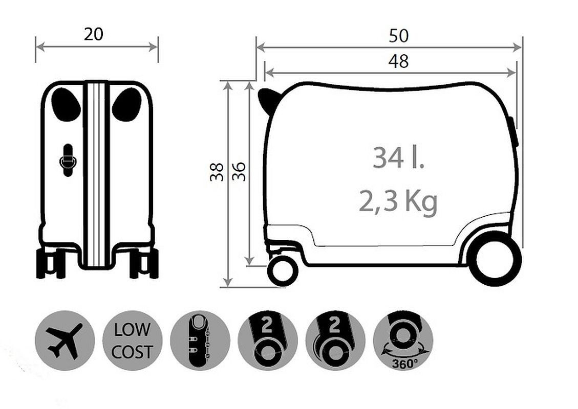 Dětský kufřík na kolečkách pro kluky i holky, velmi kvalitní skořepinový obal, odolný proti nárazům a poškození vnitřního obsahu kufru. Na tomto kufříku mohou děti jak sedět, tak i popojíždět jako na odrážedle. Přední otočná kolečka pro lepší manipulaci. Rozměr umožňuje použití též jako kabinové zavazadlo vhodné i pro nízkonákladové lety. Nosnost kufříku 30 kg.